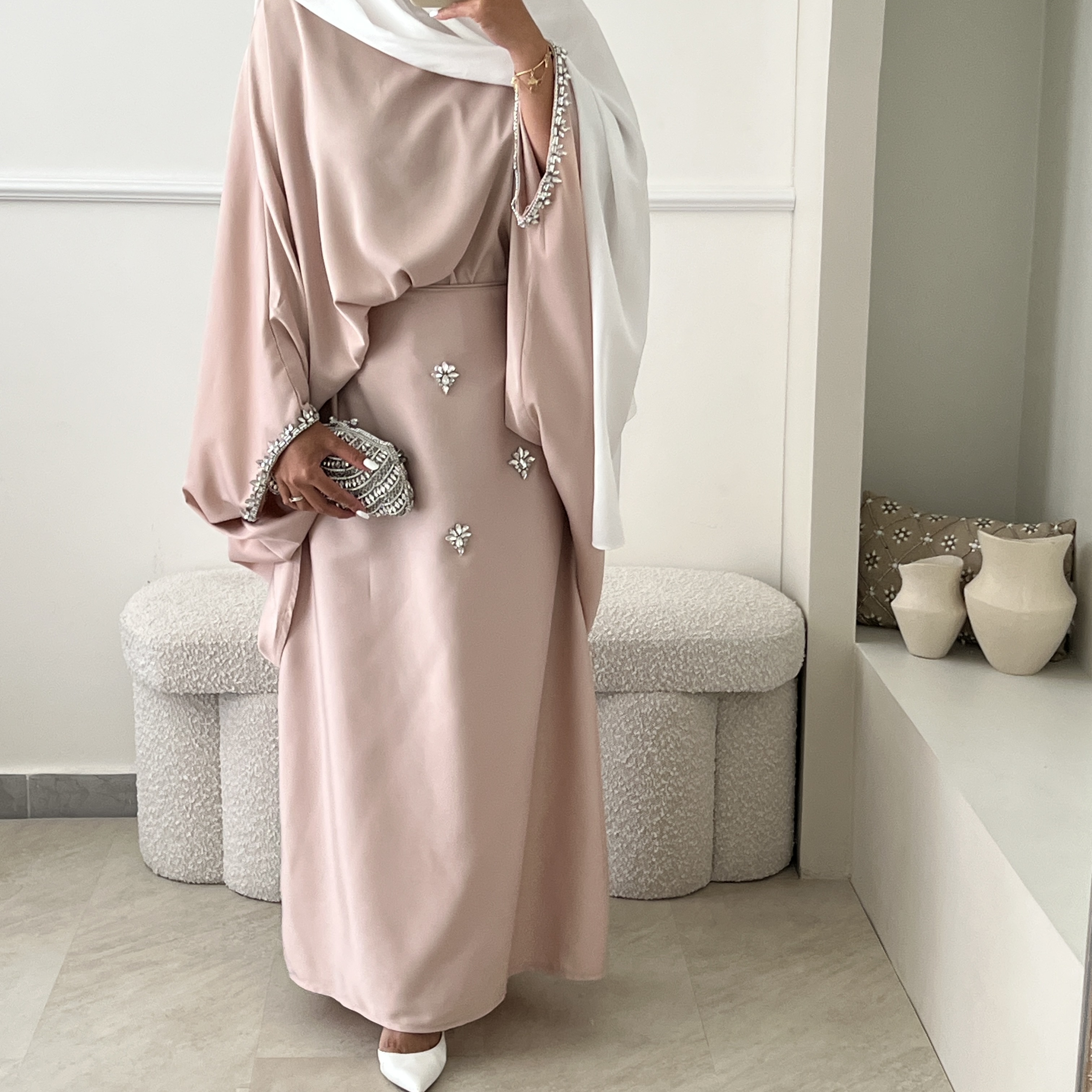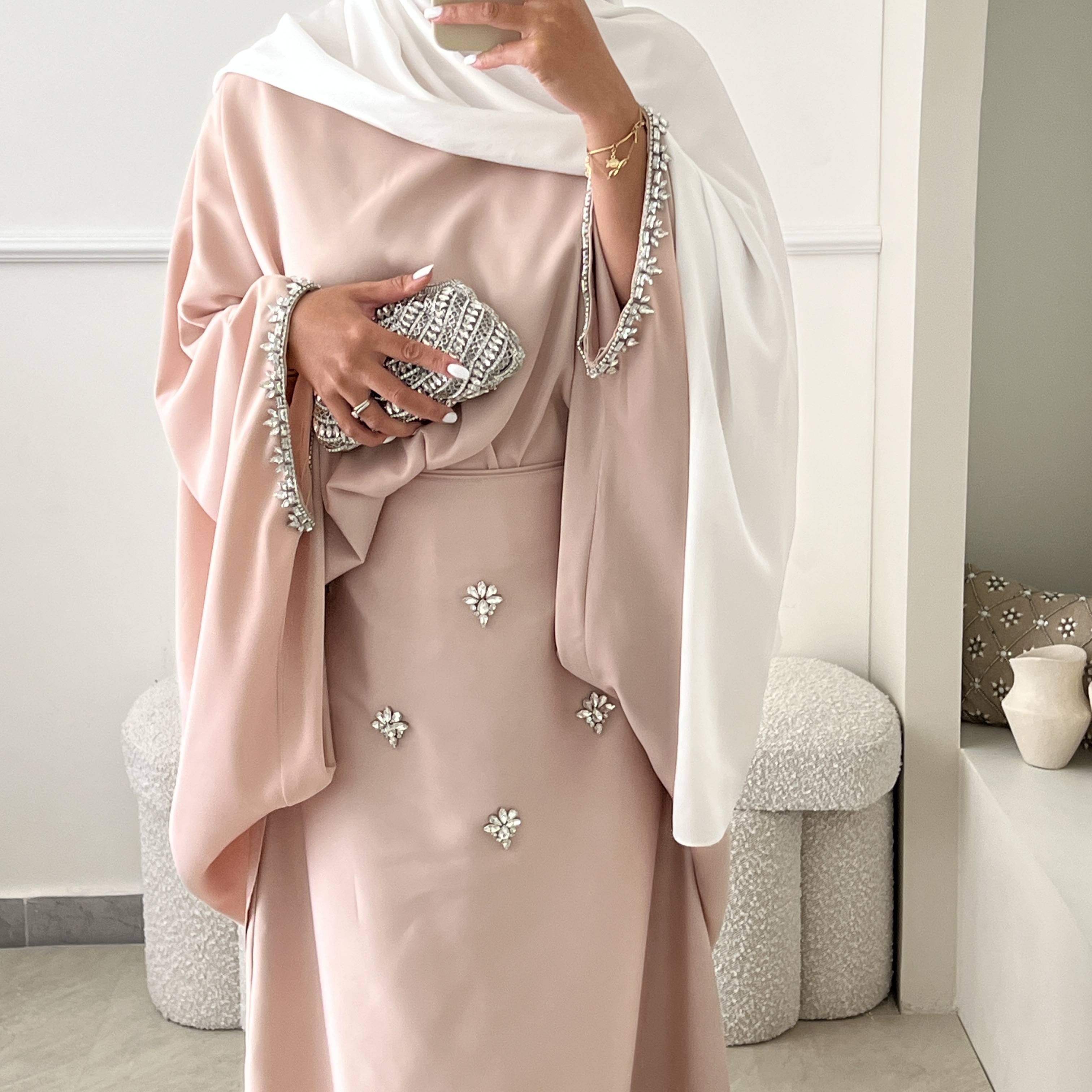 – d’une tunique évasée style faraasha, avec les manches ornées de strass, plus longue à l’arrière qu’à l’avant
