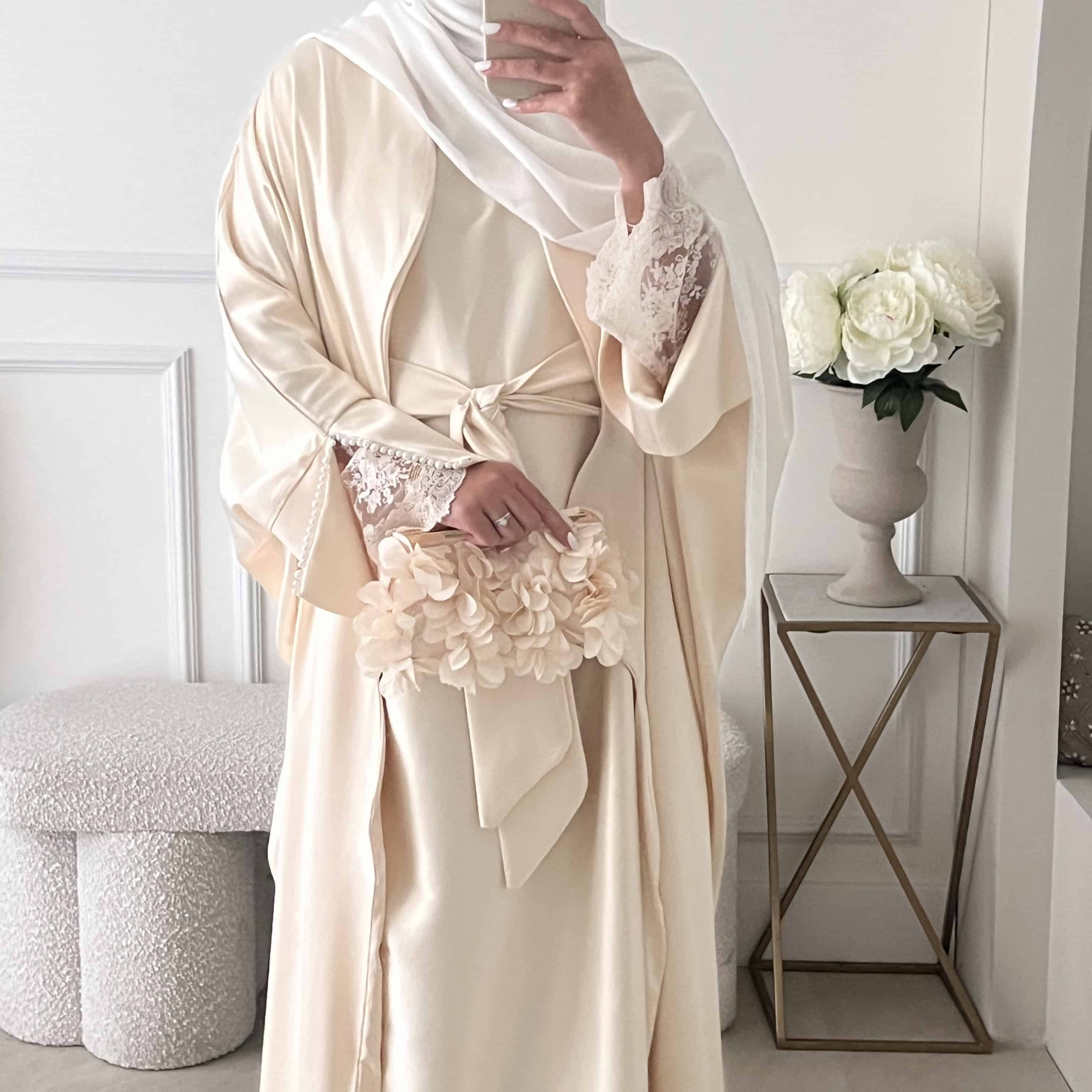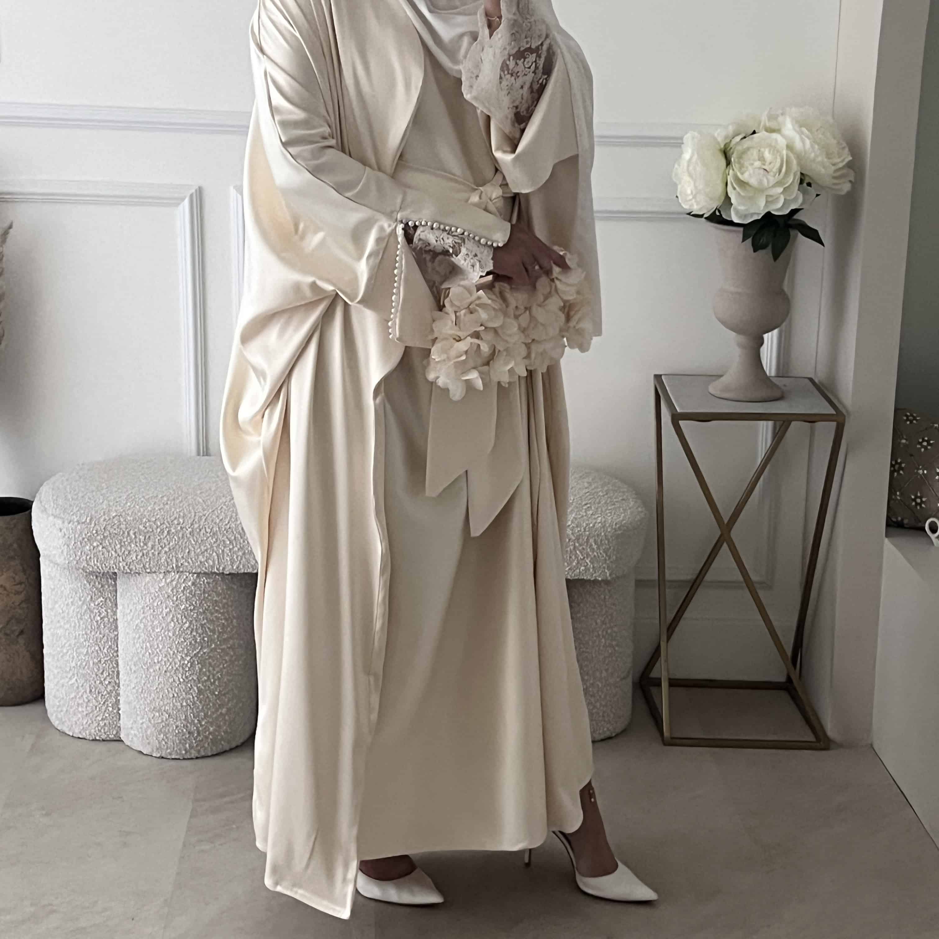 Le modèle porte la abaya sans manches beige nacrée, vendue séparément